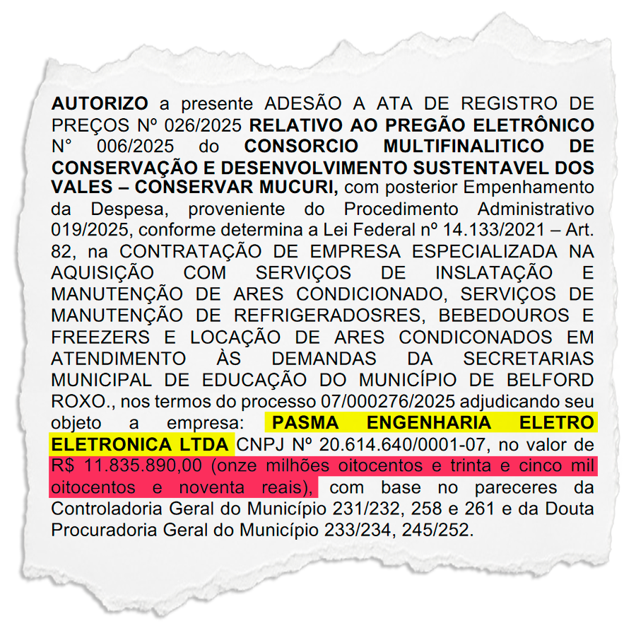 Ao longo de 2025, a Prefeitura de Belford Roxo homologou mais de R$ 350 milhões em despesas sem licitação, valendo‑se da já conhecida “carona” em atas de registro de preços formadas por consórcios de municípios de Minas Gerais. A Secretaria de Educação é a campeã nas adesões: ao menos 13 atas, somando cerca de R$ 150 milhões, entre elas a ata nº 026/2025, do Consórcio Multifinalítico de Conservação e Desenvolvimento Sustentável dos Vales (Conservar Mucuri), em favor da Pasma Engenharia Eletro Eletrônica, empresa que tinha capital social de R$ 100 mil no mês em que o ato tramitou em Belford Roxo – valor posteriormente elevado para R$ 700 mil.