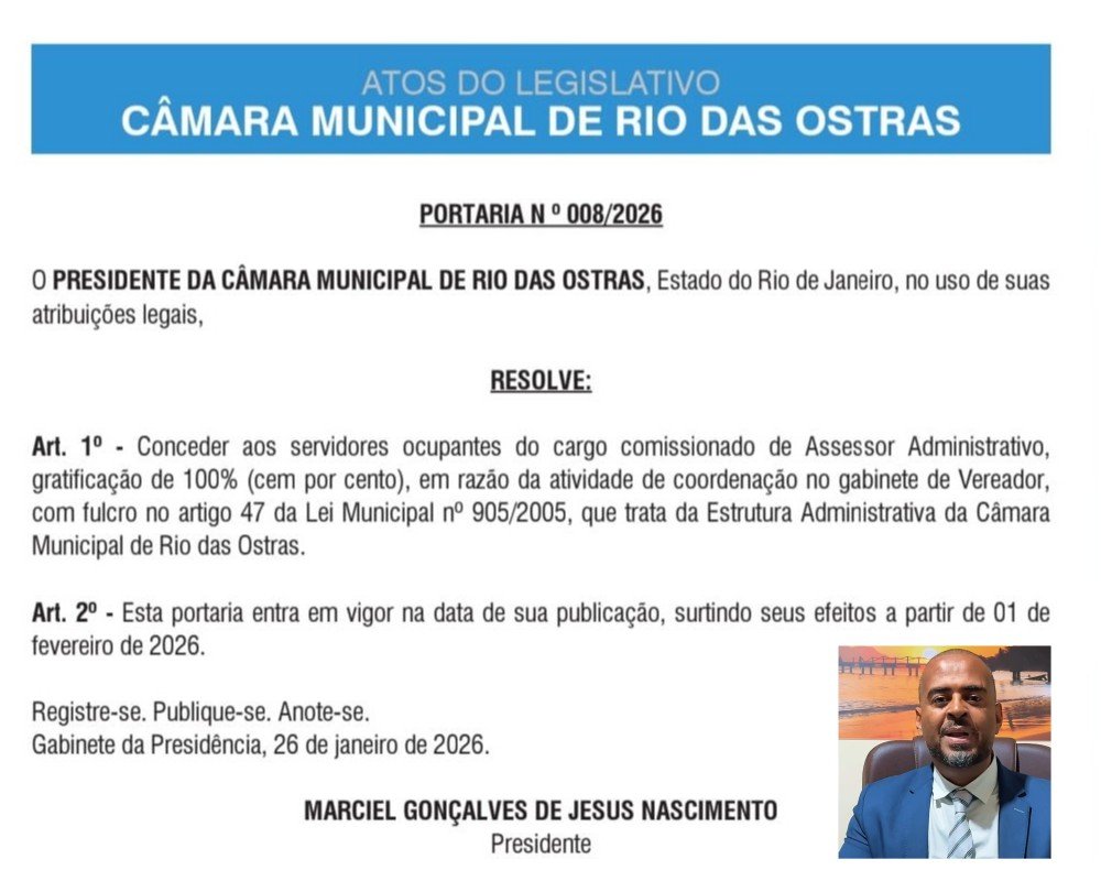 Às vésperas do Carnaval, a Câmara Municipal de Rio das Ostras se tornou palco de uma polêmica envolvendo o presidente da Casa, vereador Marciel Gonçalves (PL). Por meio da Portaria nº 008, o presidente autorizou o pagamento de gratificação de 100% aos ocupantes do cargo comissionado de assessor administrativo.