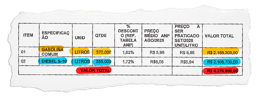 Apesar de o contrato de locação ainda estar em vigor, em outubro o então prefeito Rubem Vieira de Souza (Dr. Rubão) autorizou a contratação da empresa paulista Rede Sol Fuel para aquisição de 355 mil litros de óleo diesel e 370 mil litros de gasolina comum. O contrato, de número 209/25, no valor de R$ 4.276.900,00, foi assinado em 9 de outubro, prevendo um volume de combustível que chamou atenção nos bastidores pela dimensão informada.
