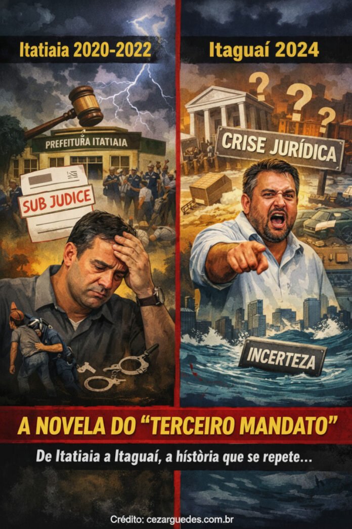 Quatro anos depois, Itaguaí encena o mesmo roteiro a 145 km de distância. Rubem Vieira de Souza (Dr. Rubão) tentou em 2024 um terceiro mandato consecutivo, foi o mais votado, mas não teve a eleição validada. Ainda assim, recorreu, conseguiu assumir por cerca de cinco meses e agora segue vendendo a tese de que uma decisão “parecida” em outro processo garantiria sua volta — juntando alhos com bugalhos enquanto a cidade afunda num mar de incerteza, com gestão e futuro travados pela insegurança jurídica.
